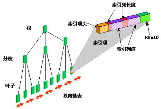 Oracle通过索引机制来加速数据的存取。Oracle的B树索引(B-Tree索引)以树型结构来存放键值(key value)。每个B树索引都有一个根节点(root),对索引进行访问时首先从根节点开始,根据和根节点上键值的比较结果,找到相应的分支节点(branch),再和分支节点的键值进行比较,最后一直找到叶子(leaf)节点。在叶子节点上,存放索引的键值和表中对应这个键值的记录的物理地址(rowid)。通过rowid,就可以直接定位到表的记录。