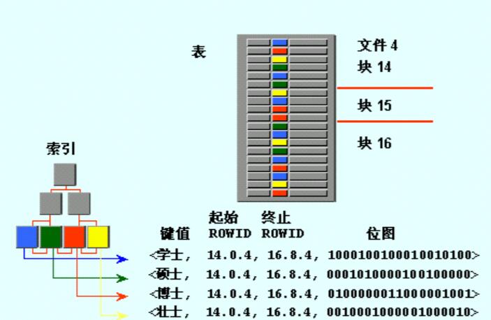 Oracle针对这种情况提供了Bitmap索引。与B-树索引相比,在某些情况下位图索引具有更多的优势。位图索引也是一种B-树结构,但是其叶子节点存放的不是ROWID,而是每一个键值的位图。